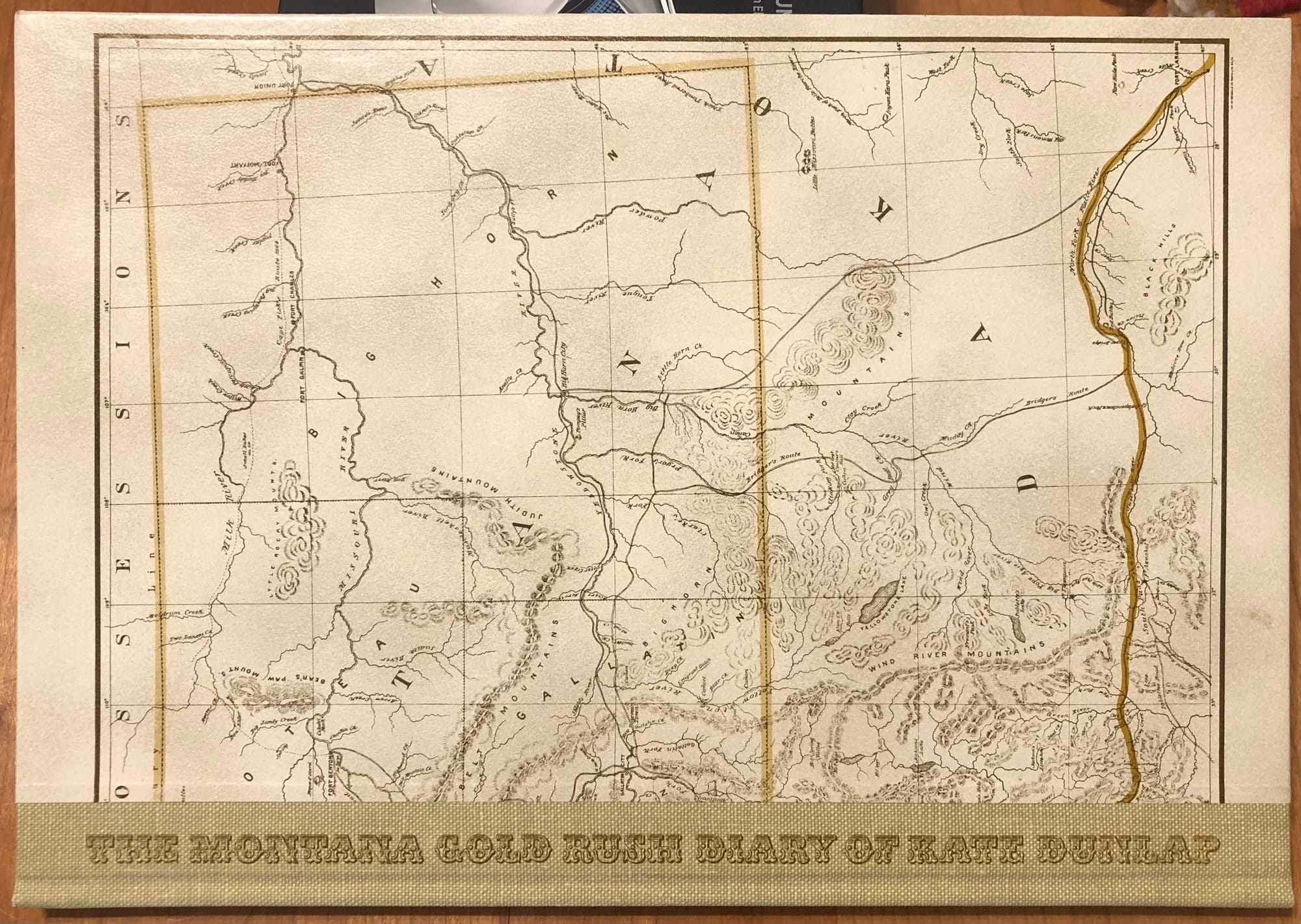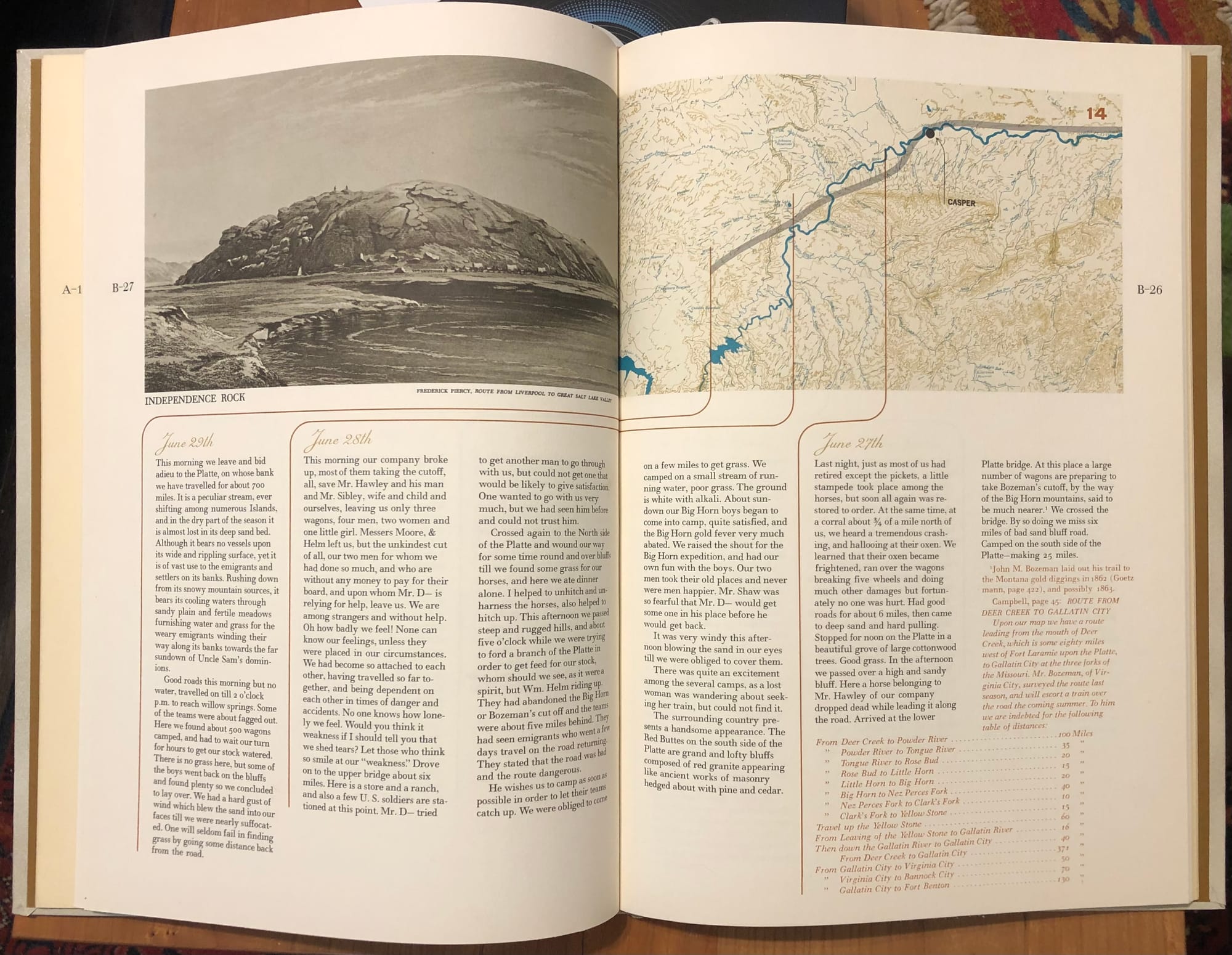 The book itself attracted me because of the unconventional format. As seen from the cover above the spine is at the bottom. Inside it contains not only Kate’s diary entries but also topographical maps of the journey with notations of mile points along the way. There was also a popular guide called Campbell’s Guide for the route at the time and excerpts from it are featured at appropriate mile points as well. This can be seen in the spread below…