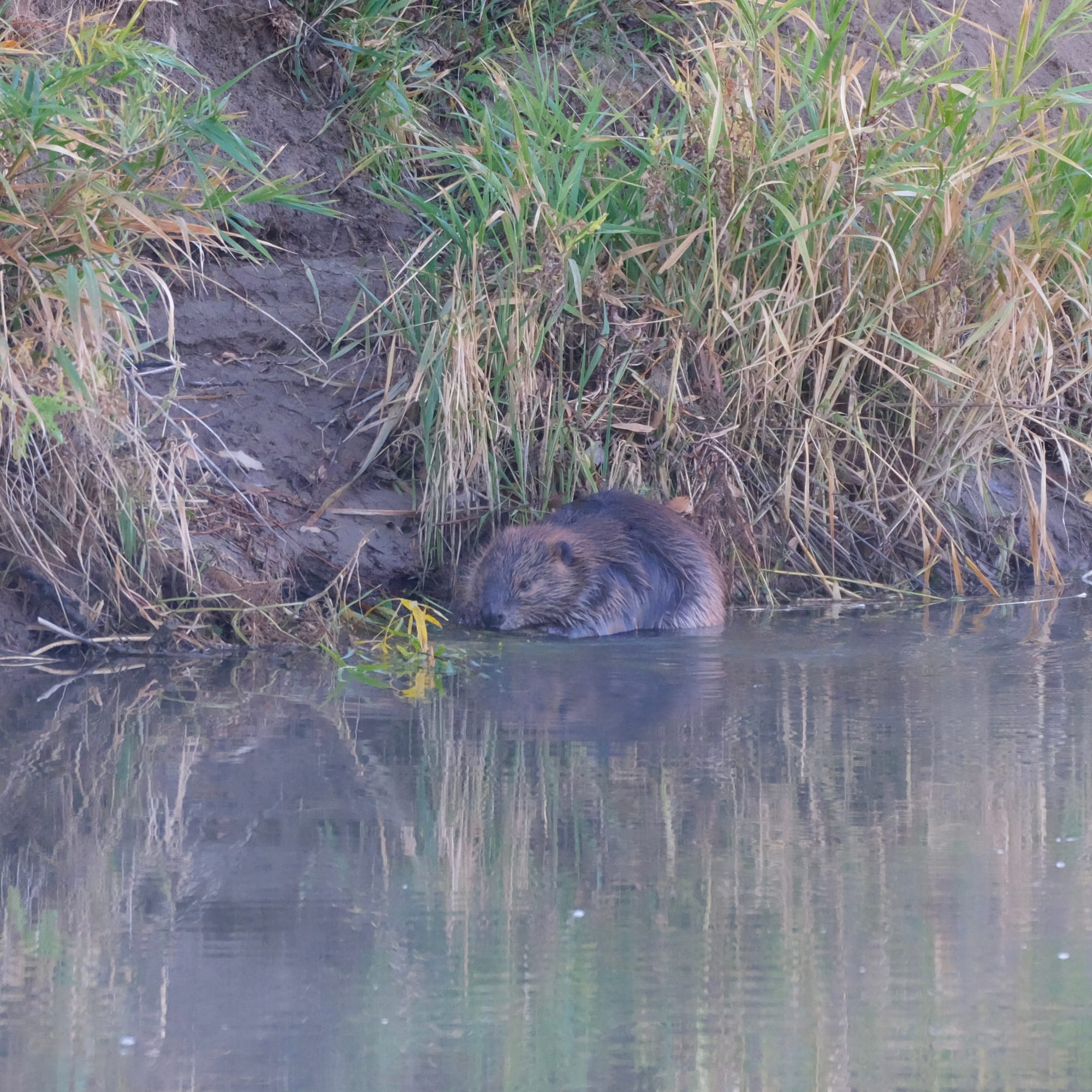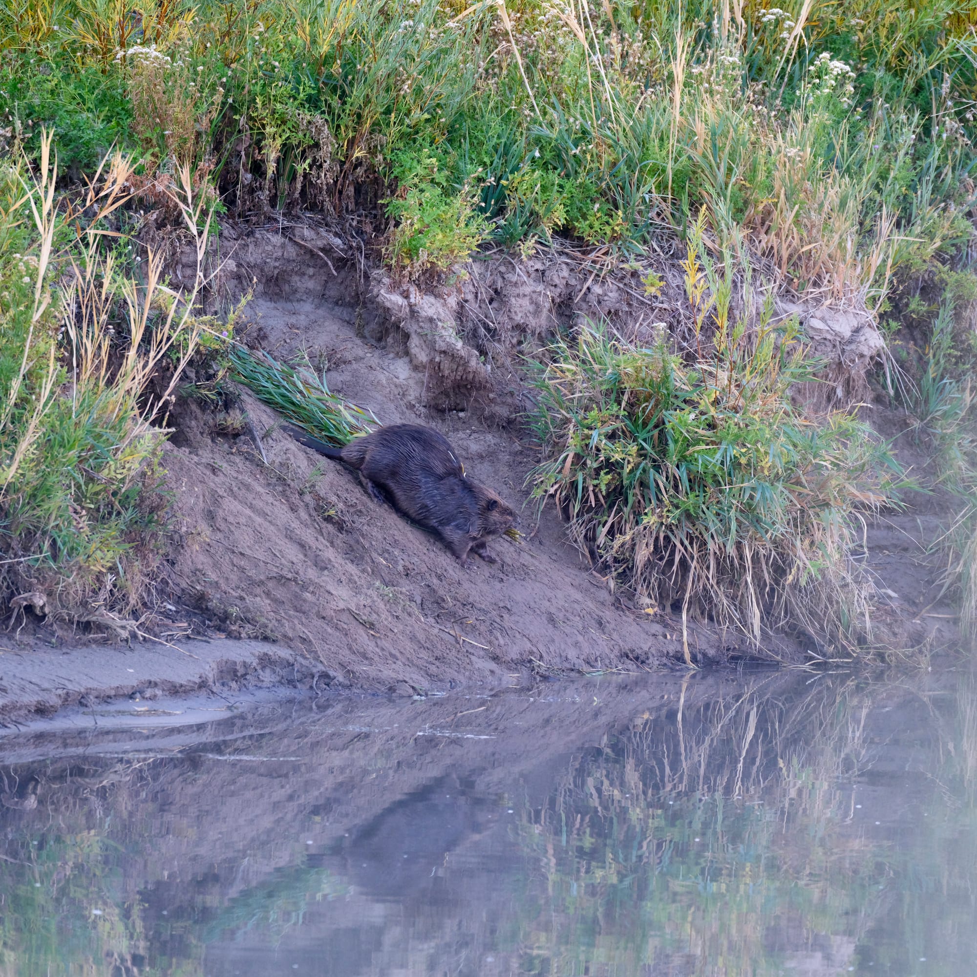 Shortly there appears a beaver descending the beaver slide with a long bundle of fresh willow it has cut. It slides into the water and carries the willow a short way downstream and begins noisily munching its breakfast.