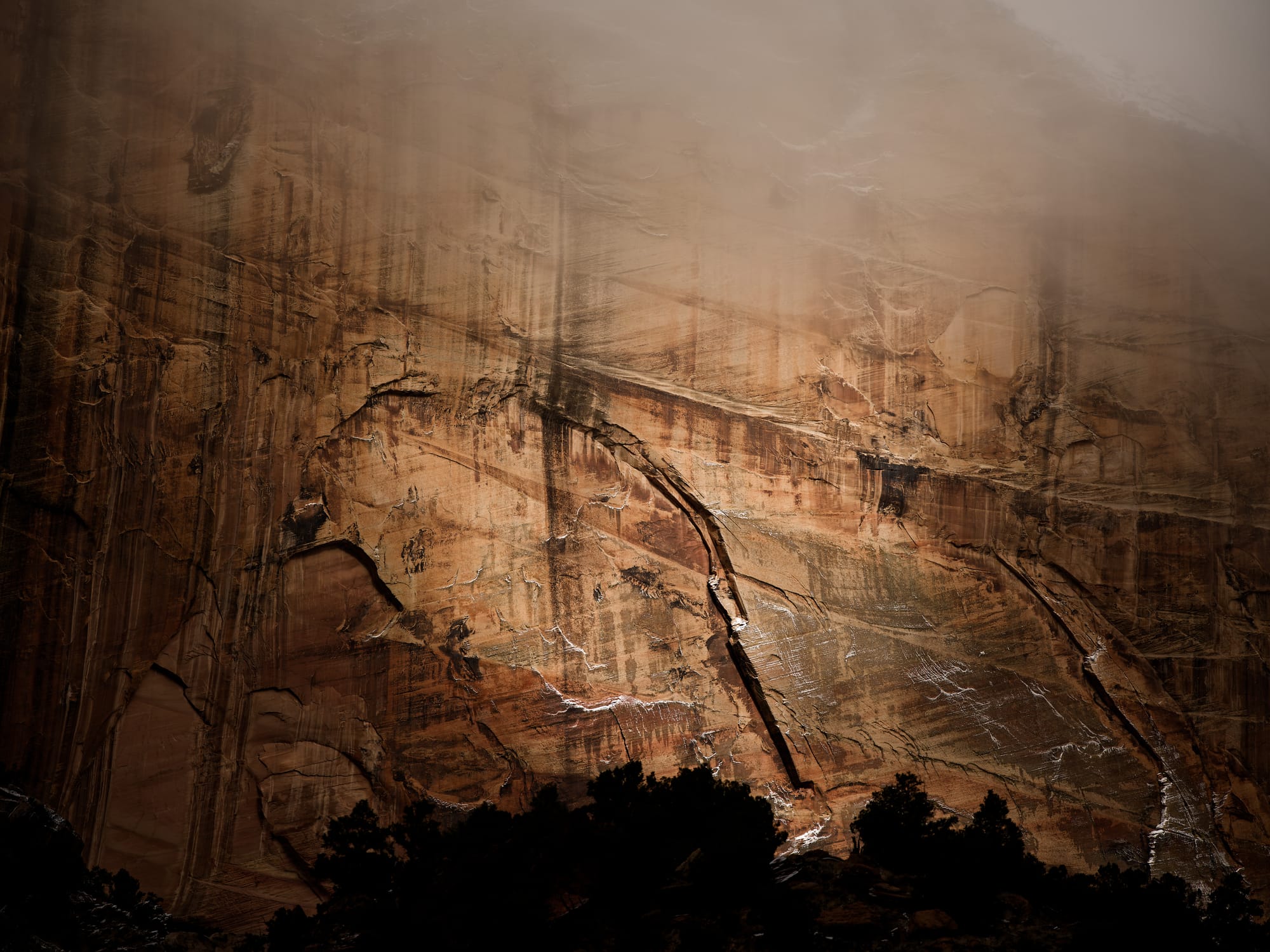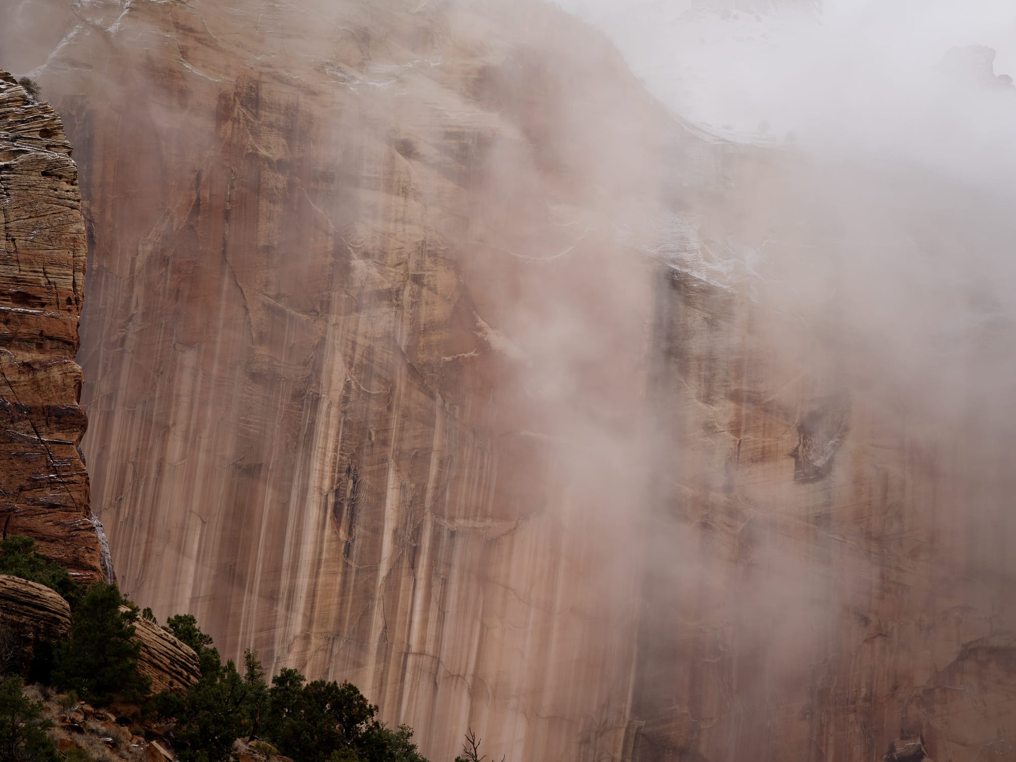 Most of these photographs were made with my Fuji GFX100s II and the GF 500mm f/5.6 lens. In Zion, most photographers opt for wide-angle lenses to capture the grandeur of the cliffs, but I’ve been experimenting with a long lens to isolate smaller landscapes within the larger whole. Seeing full-grown pines framed against immense rock faces conveys the scale of the place in a way that brings home a sense of the scale of the place.